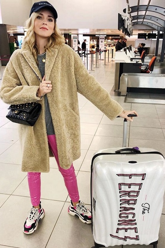 Η Chiarra Ferrangi είναι ιέρεια της μόδας και πολλές φορές έχουμε “κλέψει” ιδέες από τις εμφανίσεις της. Η ίδια επέλεξε να φορέσει ένα ροζ vinyl παντελόνι (μας αρέσει πολύ σαν πρόταση), το οποίο συνδύασε με μια γούνα σε casual ύφος, φούτερ και ugly sneakers. Αντί για σκουφάκι φόρεσε ένα jokey καπέλο.