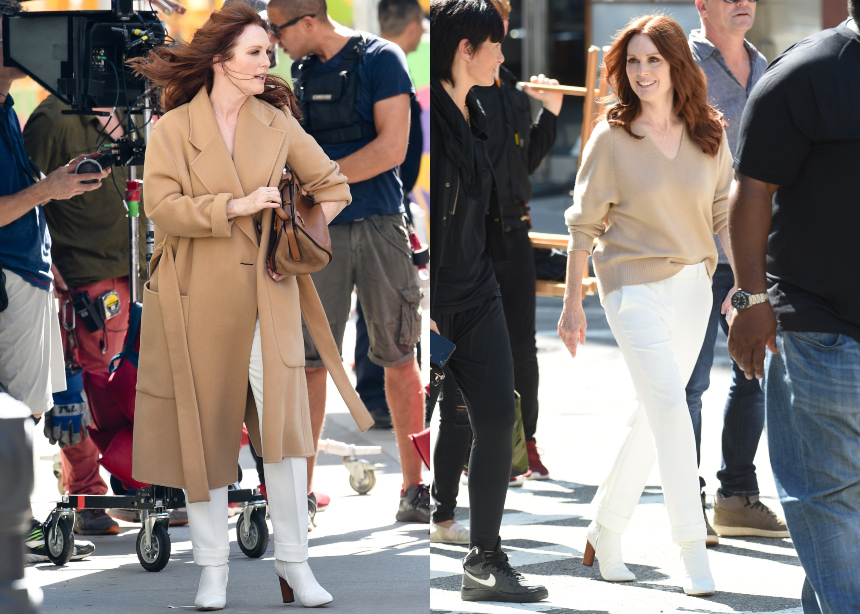 Εδώ επέλεξε να σου δείξω την Julianne Moore με και χωρίς πανωφόρι. Η στιλιστική της επιλογή μοιάζει αρκετά με της Emma stone αφού διάλεξε ένα λευκό παντελόνι και ένα camel παλτό. Το σύνολο αποθεώθηκε κι έγινε πιο κομψό με ένα μπεζ κασμιρένιο πουλόβερ και λευκές μπότες.