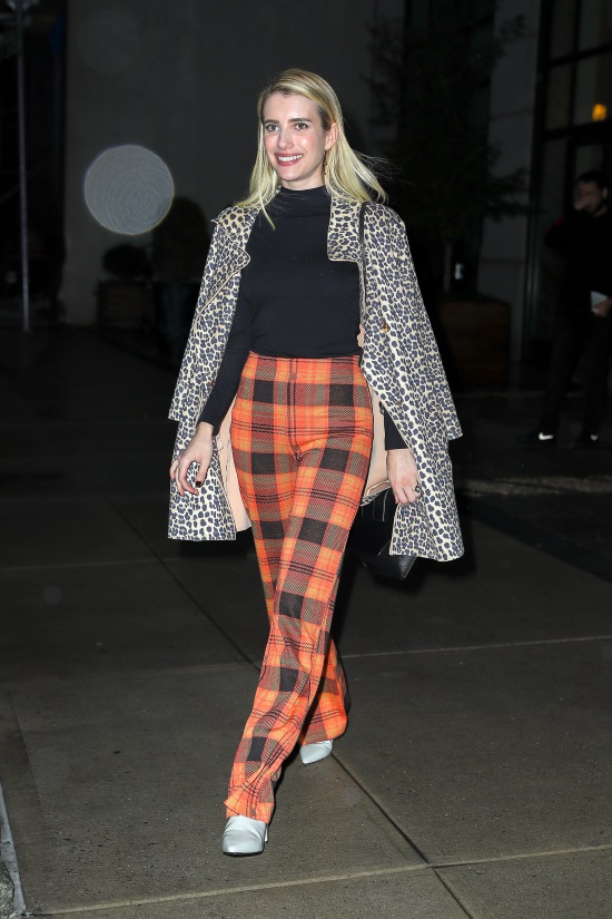 Η Emma Roberts δημιούργησε ένα μαξιμαλιστικό σύνολο που μας άρεσε πάρα μα πάρα πολύ! Το λεοπάρ παλτό απέκτησε εντελώς διαφορετικό style όταν “συνάντησε” το καρό παντελόνι. Το σύνολο δεν χρειαζόταν έξτρα στοιχεία καθώς το αποτέλεσμα θα ήταν too much. Τα λευκά μποτάκια, ένα μαύρο ζιβάγκο και μια μαύρη μίνι τσάντα έφεραν την ισορροπία.