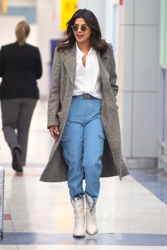 Η Priyanka Chopra φαίνεται να υποστηρίζει τα χρώματα στην καρδιά του χειμώνα. Έτσι, αποφάσισε να φορέσει ένα pastel cargo παντελόνι με ένα λευκό πουκάμισο κι ένα γκρι παλτό. Το σύνολο έγινε ακόμα πιο fresh & modern με τις λευκές west boots.