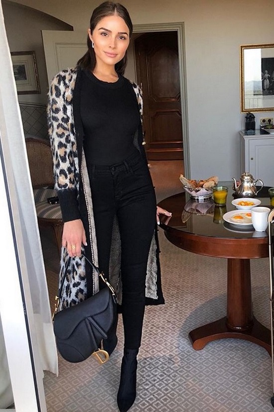 Ok, μπορεί το look της Olivia Culpo να μην έχει ένα χοντρό πανωφόρι, αλλά είναι μια πολύ ωραία ιδέα αν κυκλοφορείς κυρίως με το αμάξι και δεν έρχεσαι για πολλή ώρα αντιμέτωπη με το κρύο. Μαύρο στενό παντελόνι, μαύρο τοπ και μαύρα sock boots τα οποία “μεταμορφώθηκαν” με από βαρετά items σε έναν “καθαρό καμβά” για να αναδειχθεί με τον σωστό τρόπο η λεοπάρ ζακέτα.