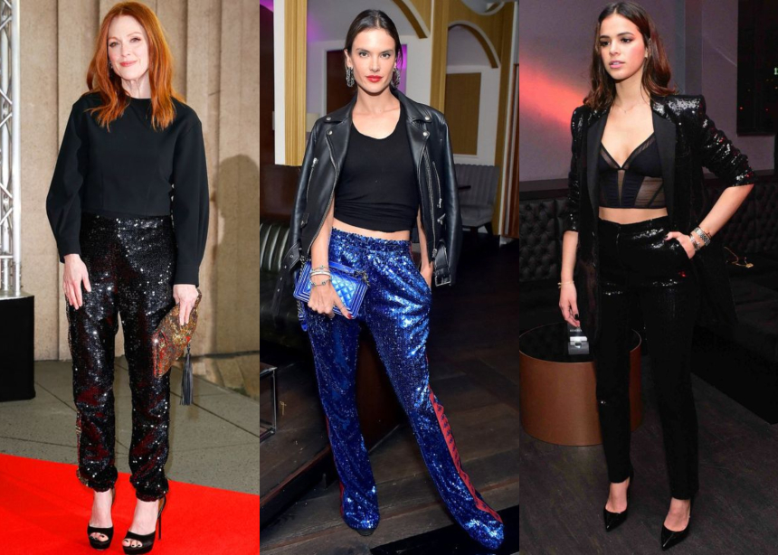 Το παντελόνι με τις παγιέτες είναι ένα δύσκολο κομμάτι που πολλές φορές αποφεύγεις γιατί πιστεύεις ότι σε παχαίνει, ότι δεν ταιριάζει κάτι για να έχεις ένα ωραίο αποτέλεσμα. Για αρχή θέλω να σου πω ότι όσο πιο απλά κινηθείς, τόσο πιο safe και stylish θα νιώθεις. Για παράδειγμα, μπορείς να φορέσεις ένα μαύρο sequin παντελόνι με μαύρο τοπ και μαύρα ή μεταλλικά αξεσουάρ για να μην πέσεις σε στιλιστικές παγίδες. Αν θέλεις κάτι πιο “σύνθετο” μπορείς να ακολουθήσεις τα βήματα της Alessandra Ambrosio και να αναδείξεις ένα τέτοιο παντελόνι με ’80s style που θα απαρτίζεται από ένα ένα leather jacket και μποτάκια. Εναλλακτικά, επέλεξε total black look με ένα sequin κοστούμι, φόρεσε ένα sexy top και θηλυκές γόβες και είσαι πολύ οκ για μια festive εμφάνιση.